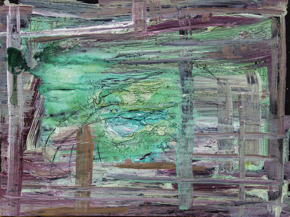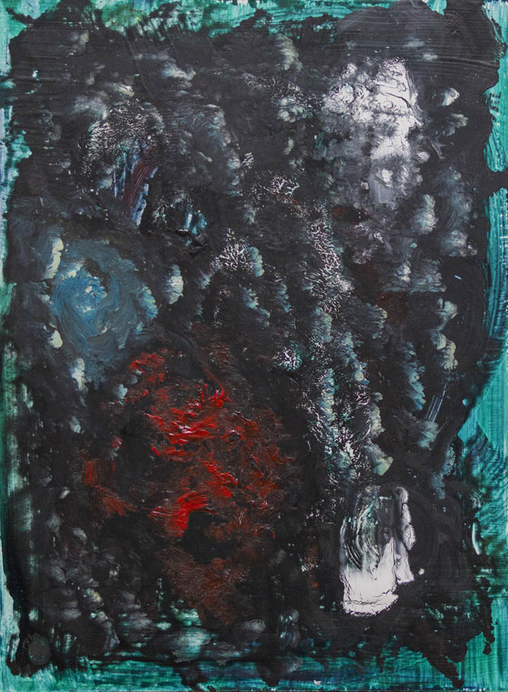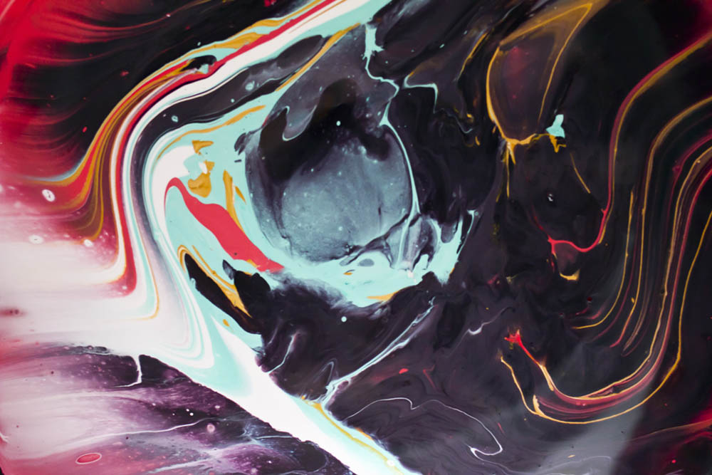 Color pigments are dropped in a bucket of white latex paint and then swirled. The contents are photographed while forms are slowly created.